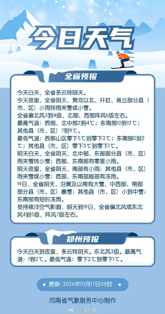 雨雪:今天夜里,黄河以北、开封、商丘部分县(市、区)小雨转雨夹雪或小雪。